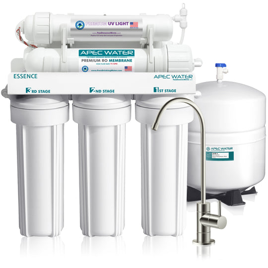 The APEC ROES-UV75 offers advanced reverse osmosis filtration with UV sterilization, ensuring ultra-pure, great-tasting drinking water by removing up to 99% of contaminants and microorganisms.