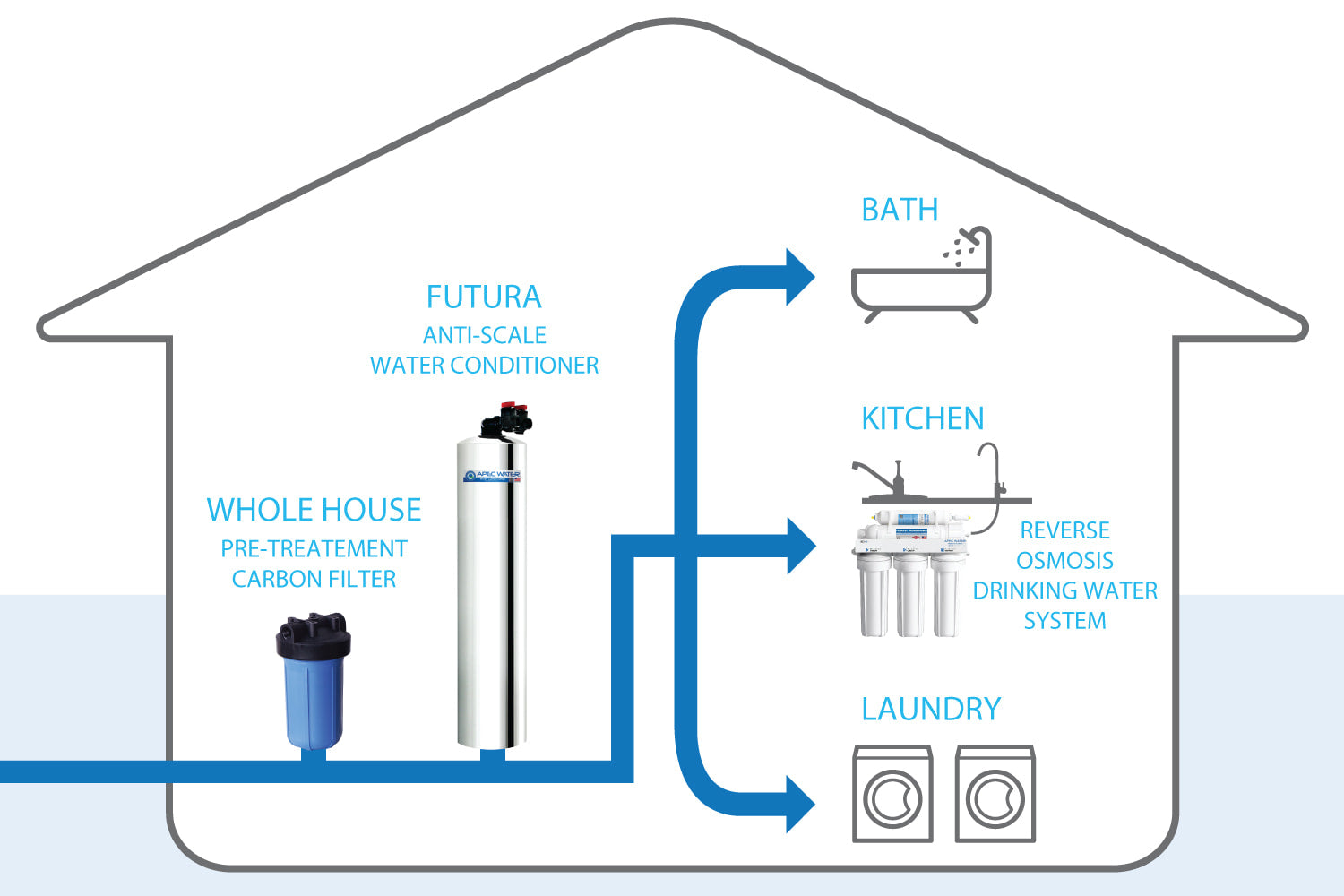 For over 20 years, APEC has been the leading manufacturer of high performance water systems. Our systems are built to meet the most demanding applications in water treatment-- from drinking water for homes, healthcare facilities, research labs to scale free water for factories. Our durable FUTURA water conditioning systems last for decades delivering many years of quality water enjoyment and convenience to their owners.
