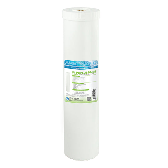 Clean, Balanced WaterThe FI-PHPLUS20-BB filter cartridges utilize calcite media to neutralize low pH conditions and to re-mineralize acidic water that is low in minerals. Calcite is a naturally occurring calcium carbonate mineral which is often used to treat acidic water conditions and is completely safe for use with drinking water. These filters will make water less aggressive by increasing the alkalinity of soft water while improving the overall chemical balance and taste. The resulting treated water will also have higher mineral content which will protect your water appliances and pipes from the damaging effects of corrosion. With this filter, you will be able to enjoy more naturally balanced and alkaline water. The FI-PHPLUS20-BB filter can treat up to 24,000 gallons and will fit in our 20 Inch standard Big Blue housings. Benefits and Applications